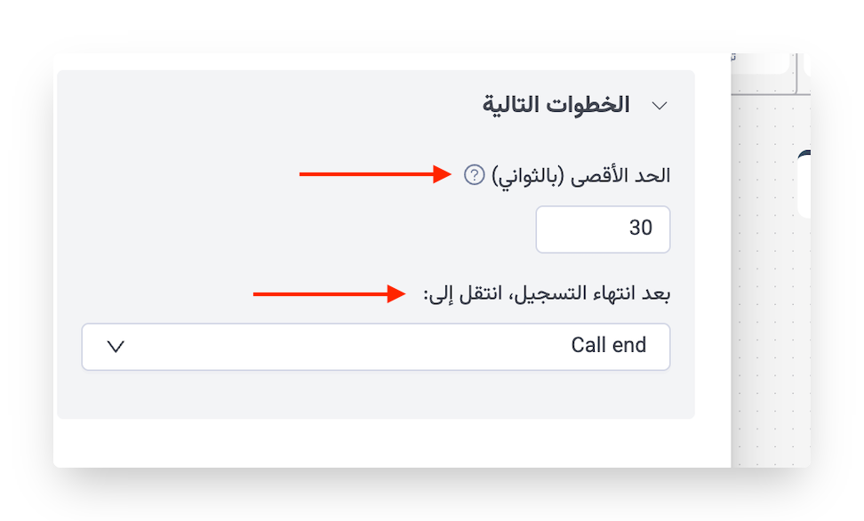 - بعد انتهاء التسجيل، انتقل إلى: يحدد الخطوة التالية في IVR بعد انتهاء المتصل من التسجيل.