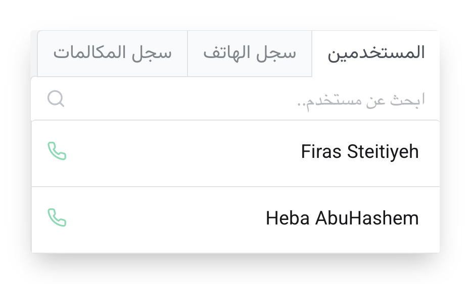 يتيح علامة التبويب المستخدمين لممثلي الخدمة عرض واختيار ممثلين خدمة الآخرين حيث يمكنهم إجراء اتصالات داخليًا. سيتمكن ممثلين الخدمة المصرح لهم من رؤية أسماء ممثلي الخدمة الآخرين والاتصال بهم داخليًا، مع القدرة على البحث عنهم تحدت علامة تبويب المستخدمين.