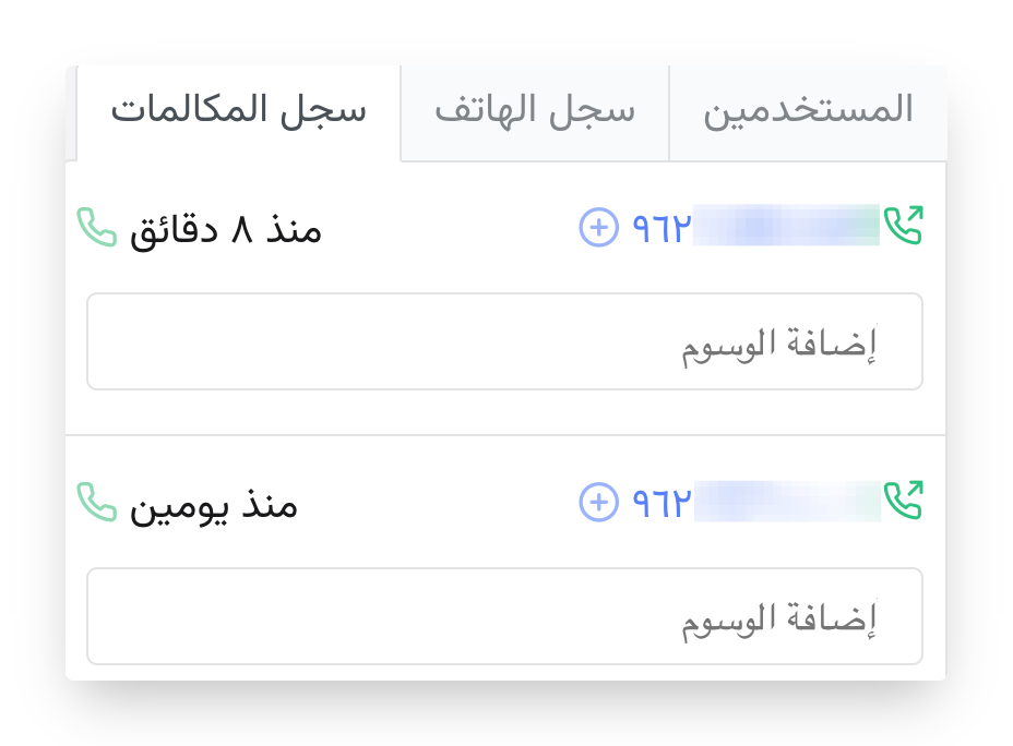 يعرض سجل المكالمات لائحة من المكالمات التي قام بها ممثل الخدمة سابقاً مع القدرة على الحفظ في دليل الهاتف وإضافة الوسوم وعرض وقت المكالمة.