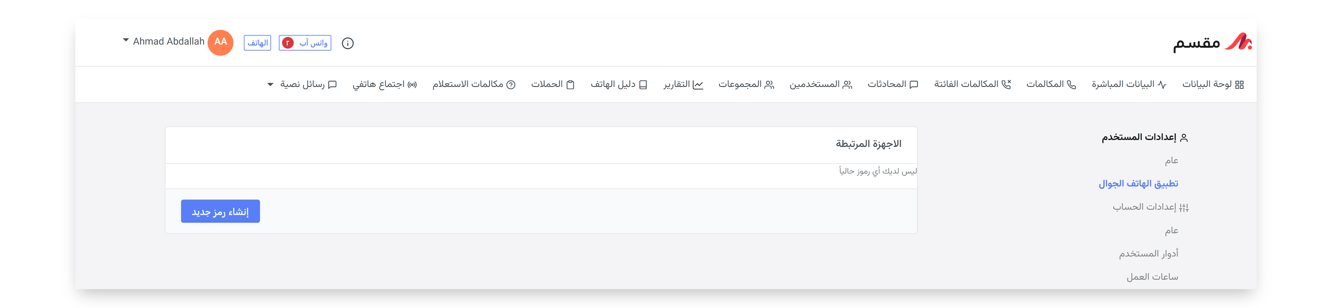 يرجى الملاحظة انه في حال عدم ظهور علامة تبويب "تطبيق الهاتف الجوال" على حسابكم من خلال بوابة مقسم، يمكنكم التواصل مع فريق الدعم على Support@maqsam.com حتى يتسنى لفريق الدعم اتاحة الهاتف الجوال على حسابكم. بمجرد تفعيله من قبلنا، يمكنك الوصول إلى "تطبيق الهاتف المحمول" في إعدادات حسابك.