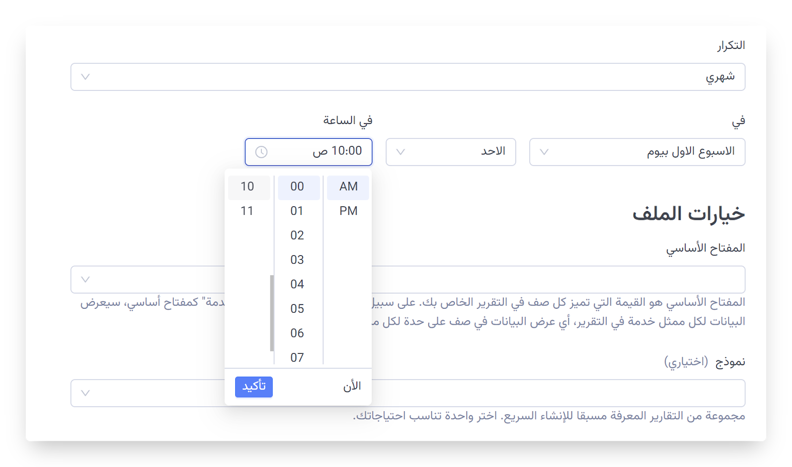 في الساعة: اختر الوقت الذي سيتم إنشاء التقرير فيه.