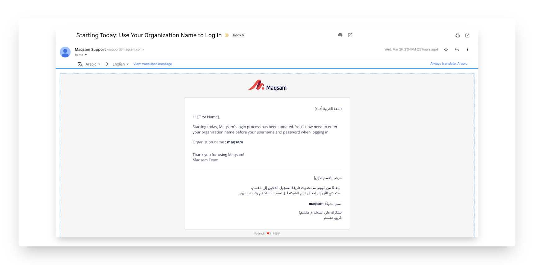 • ابحث عن الرسالة بعنوان: "Starting Today: Use Your Organization Name to Log In"