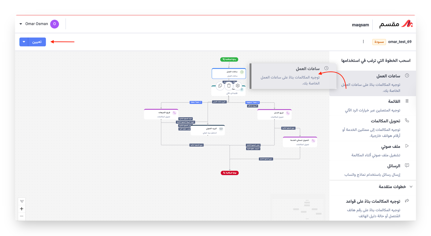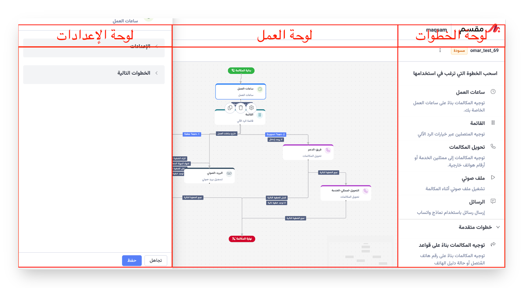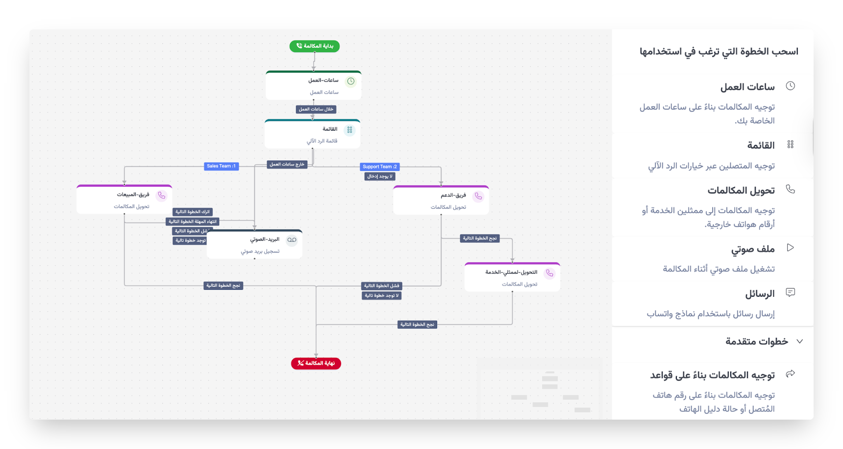 🎨 تصميم مسارات المكالمات بصريًا باستخدام خطوات محددة مسبقًا.