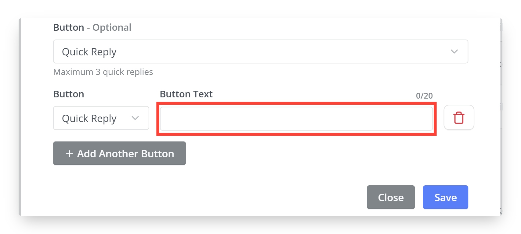 - Quick Replies: You can add up to 3 quick reply buttons per template. These buttons allow customers to respond by tapping them, sending the button's text as a message in the conversation.