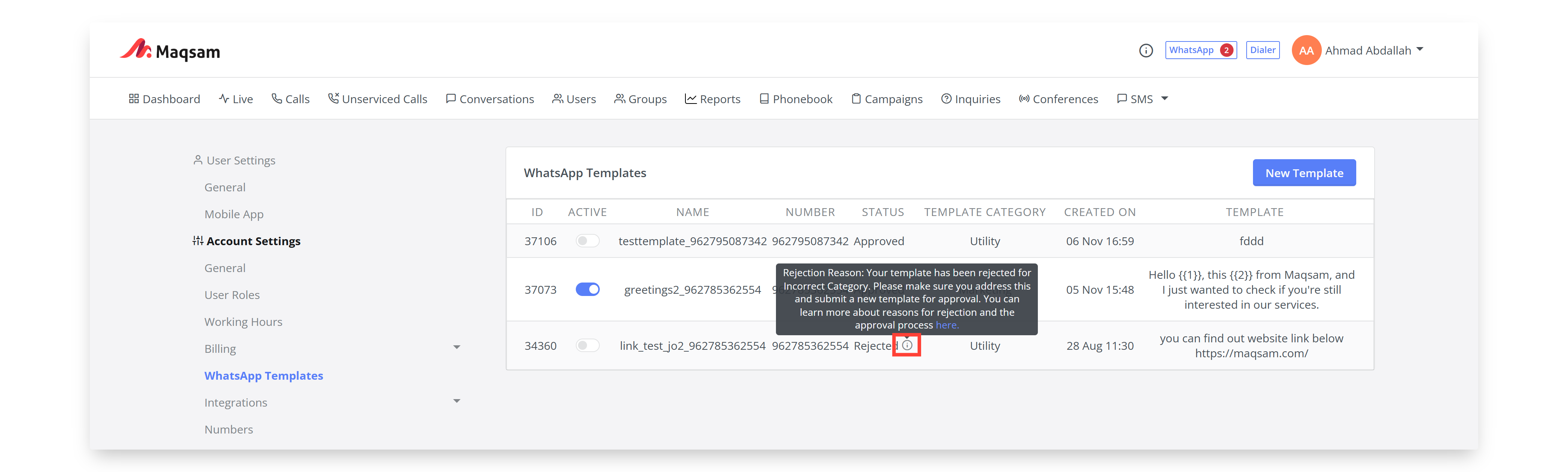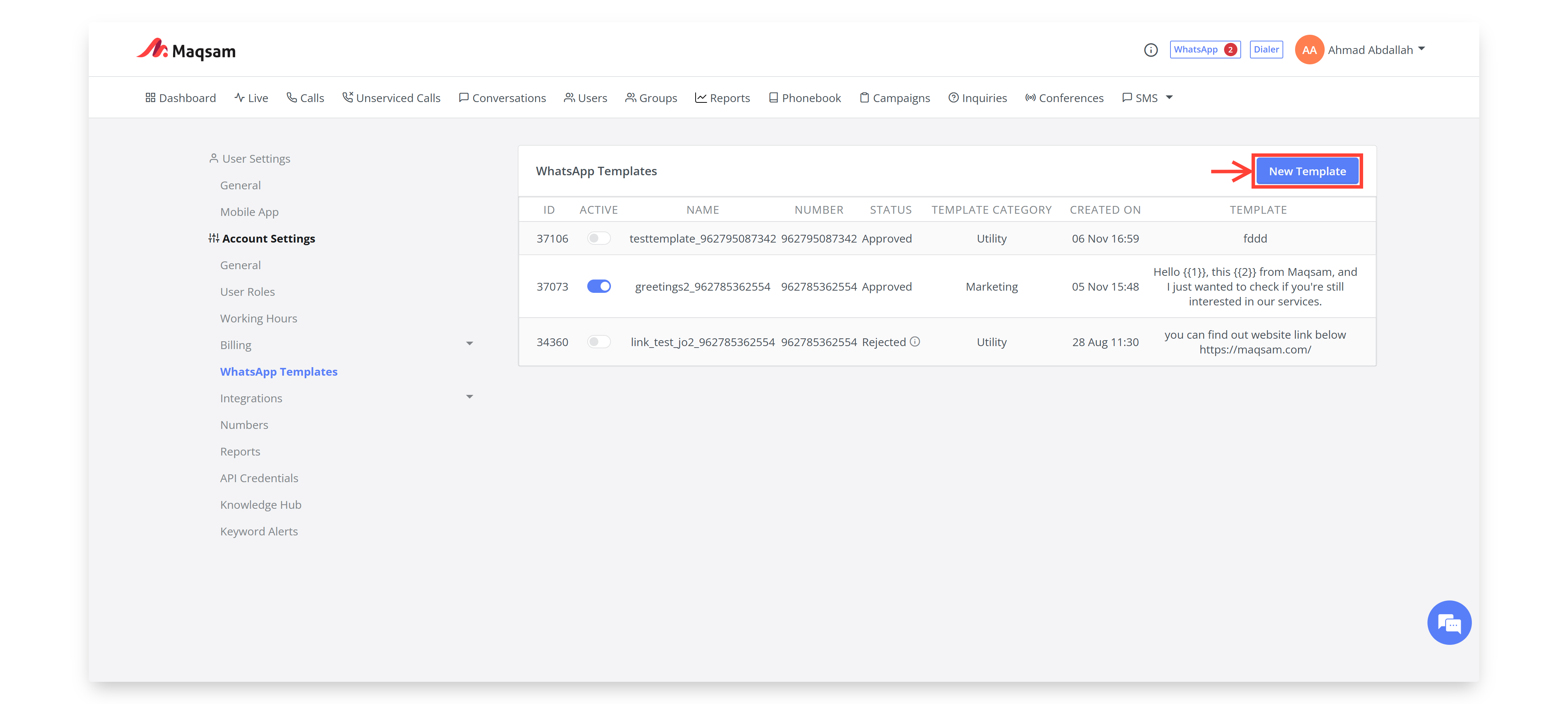 By following this guide, you’ll be able to create and manage WhatsApp templates effortlessly in Maqsam’s Setting.