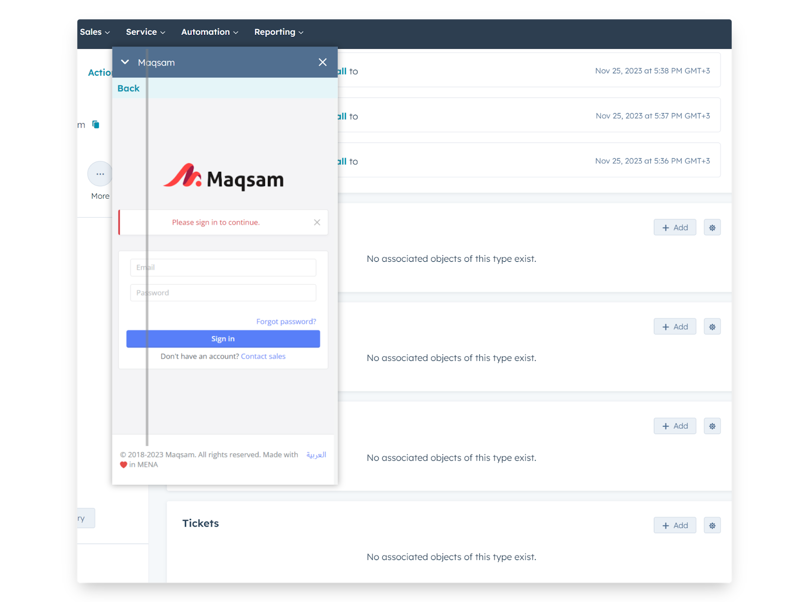 Some browsers (like Safari) may block Maqsam login on HubSpot due to cookie restrictions. Signing in once on the Maqsam website allows cookies and enables a successful login on HubSpot.