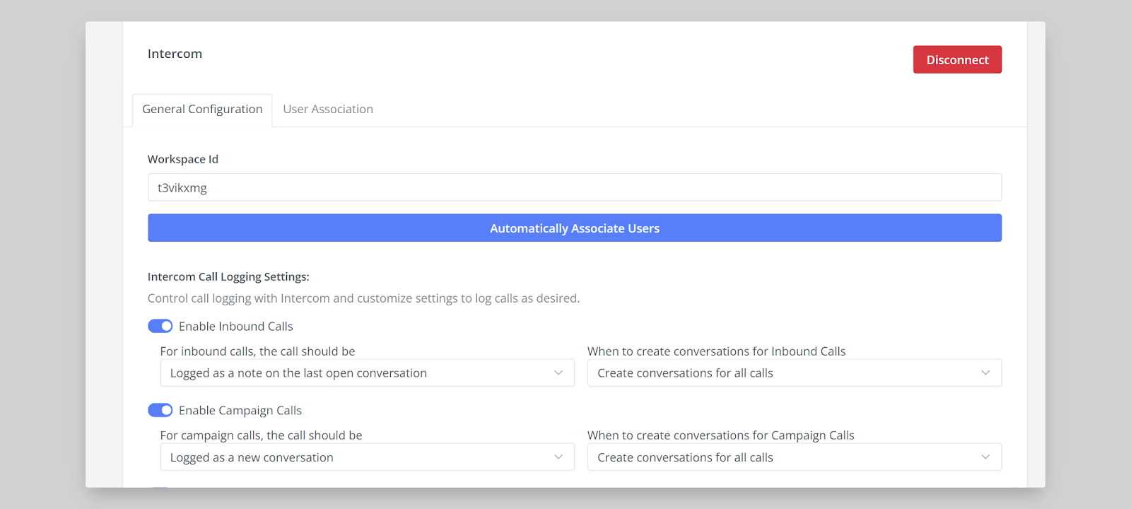 After successfully setting up the Intercom integration with Maqsam, you can customize how the integration works to suit your workflow. Below are the configuration options available: