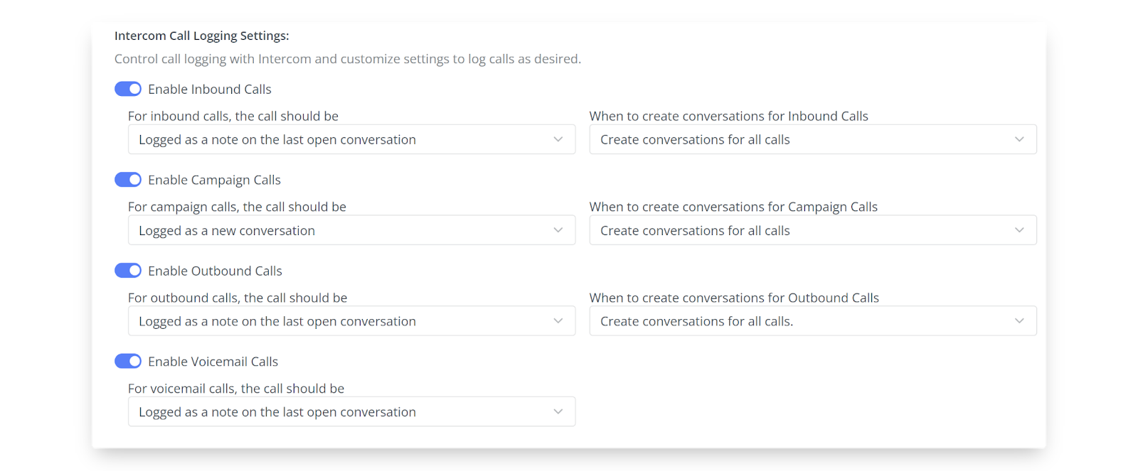 - Choose which types of calls should be logged into Intercom by enabling the toggle beside each call direction or type.