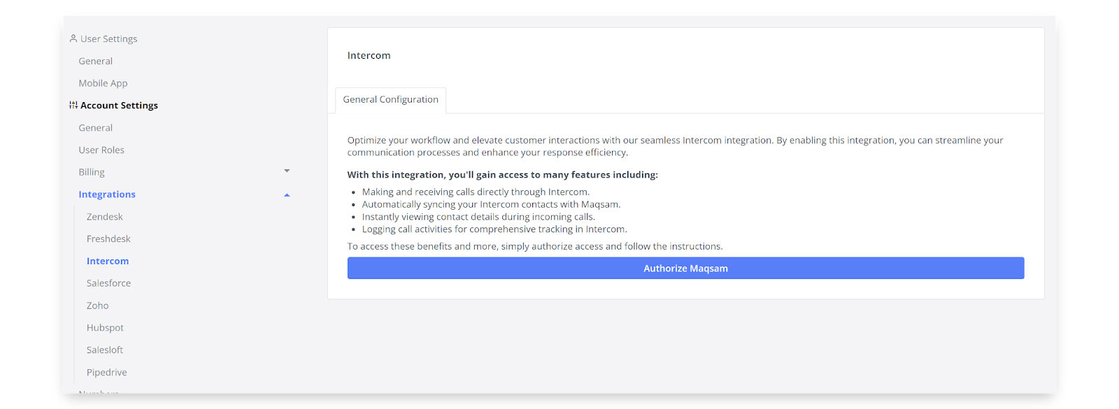 - Click on ‘Authorize Access’. Once it's done successfully, you will be redirected to Intercom Settings page on Maqsam.