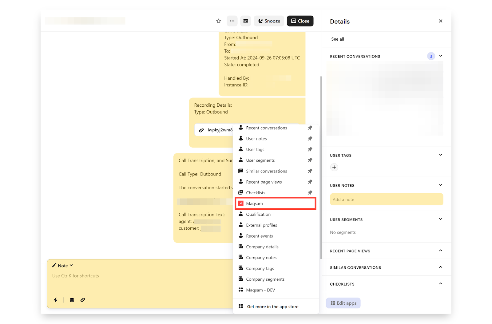 - Sync Call Transcription and Summary: Enable this to automatically sync call transcriptions and summaries from Maqsam to Intercom conversations.