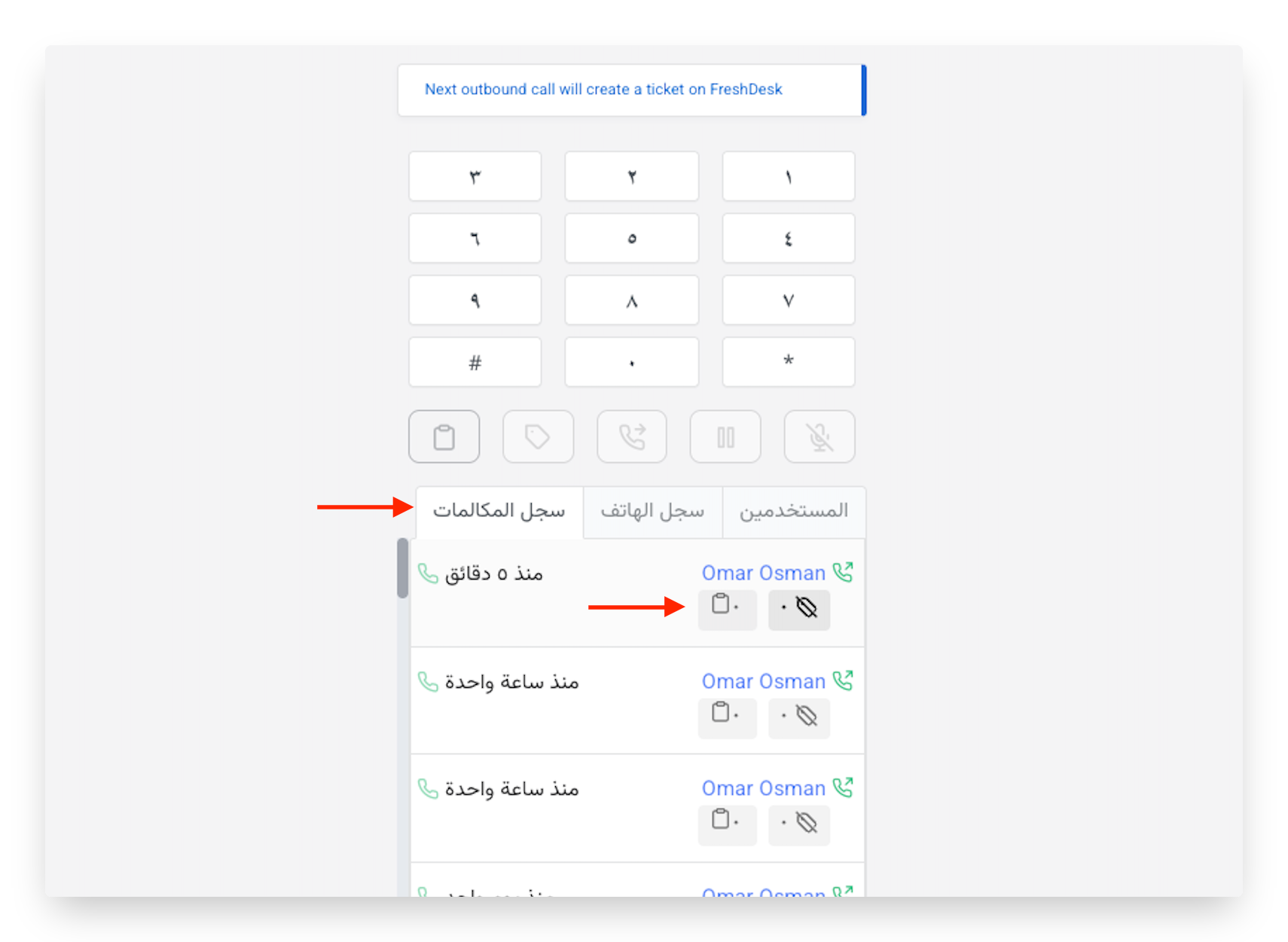 صفحة المكالمات: أضف الملاحظات في أي وقت بعد انتهاء المكالمة.