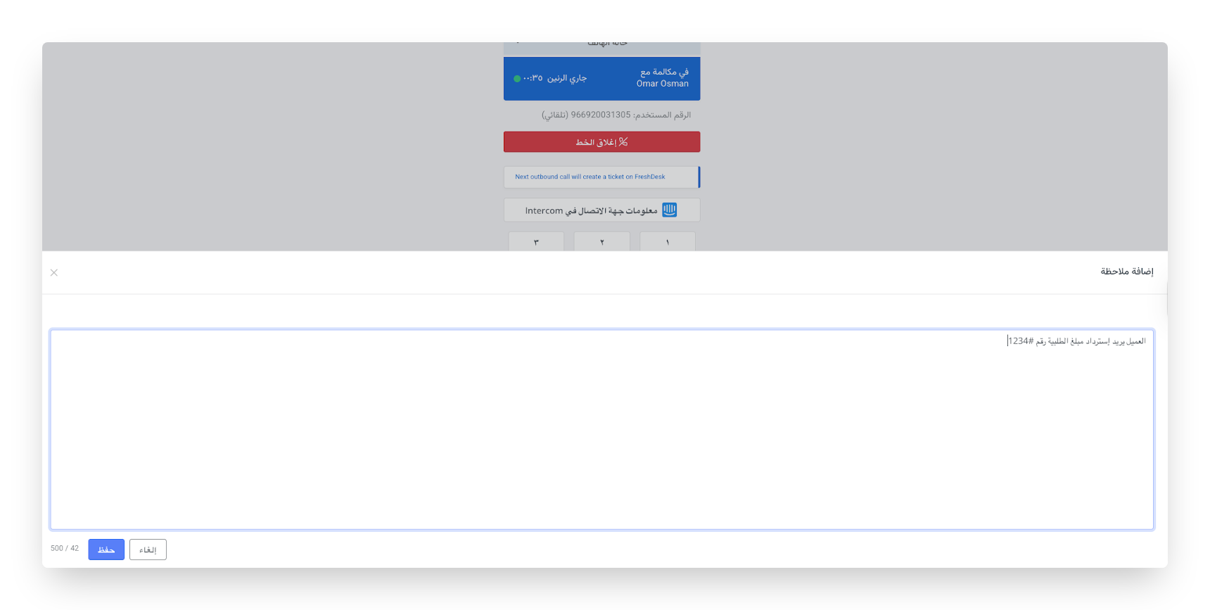 بعد الحفظ، تظهر الملاحظة مباشرة في قسم ملاحظات المكالمة مع اسم الكاتب والطابع الزمني. يتم إضافة الملاحظات اللاحقة حسب الترتيب الزمني، مما يخلق سلسلة من التعليقات. يقوم جدول المكالمات بتحديث عداد الملاحظات بحيث يمكنك رؤية أي المكالمات تحتوي على ملاحظات موجودة.