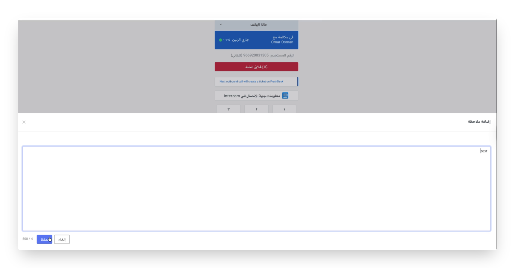 بعد الحفظ، يعرض النافذة رسالة تأكيد مؤقتة مثل “تم حفظ الملاحظة بنجاح”. بعد ذلك يمكنك إغلاق النافذة. ستكون جميع الملاحظات التي تمت إضافتها أثناء المكالمة متاحة لاحقًا في صفحة المكالمات، مجمعة تحت قسم ملاحظات المكالمة لتلك المكالمة المحددة.