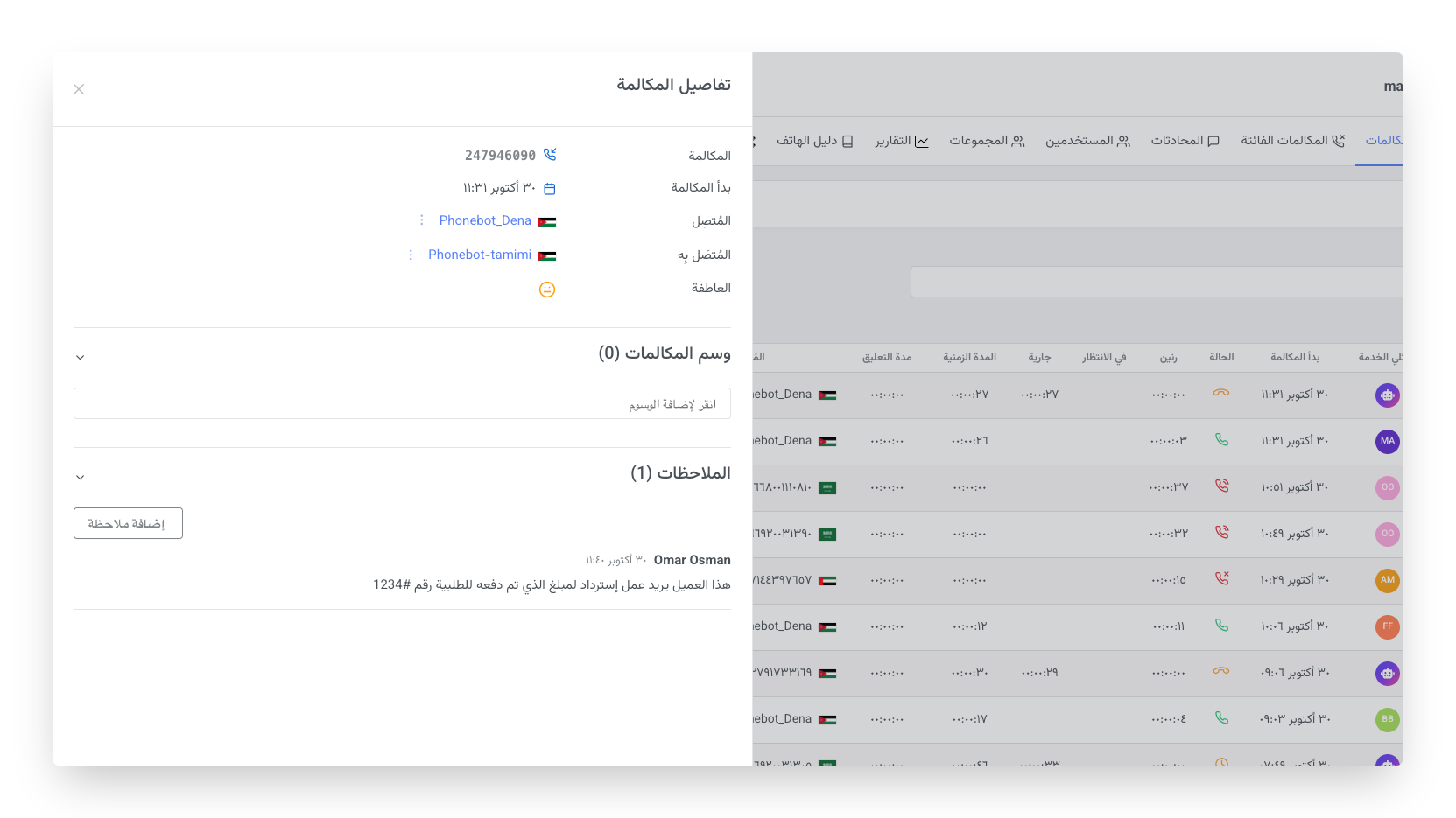 يؤدي الضغط على أيقونة الملاحظة إلى فتح لوحة جانبية على اليمين تتضمن تفاصيل المكالمة مثل معلومات المتصل/المستقبل، والوسوم، وقسم ملاحظات المكالمة. عندما لا توجد ملاحظات، يعرض القسم عبارة “لا توجد ملاحظات بعد” وزر إضافة ملاحظة (انظر الصورة أدناه).