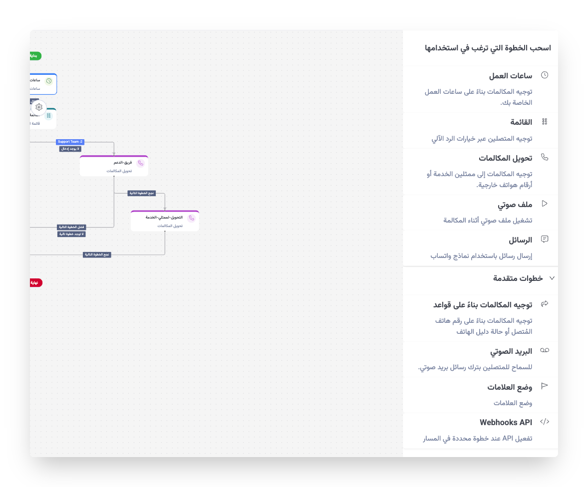 🎨 تصميم مسارات المكالمات بصريًا باستخدام خطوات محددة مسبقًا.