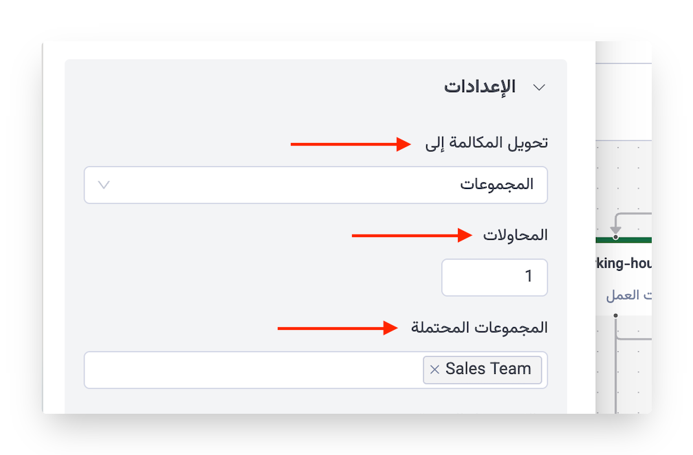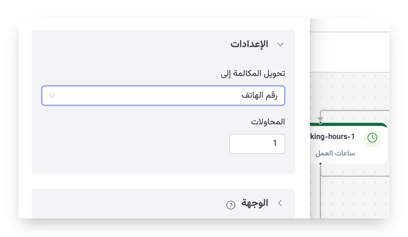 المحاولات: يحدد عدد المحاولات التي يجريها النظام لتوصيل المكالمة إذا لم يجب ممثل الخدمة. إذا كان ممثل الخدمة الأول غير متاح، يعيد النظام المحاولة مع ممثل آخر بناءً على عدد المحاولات المحدد.
