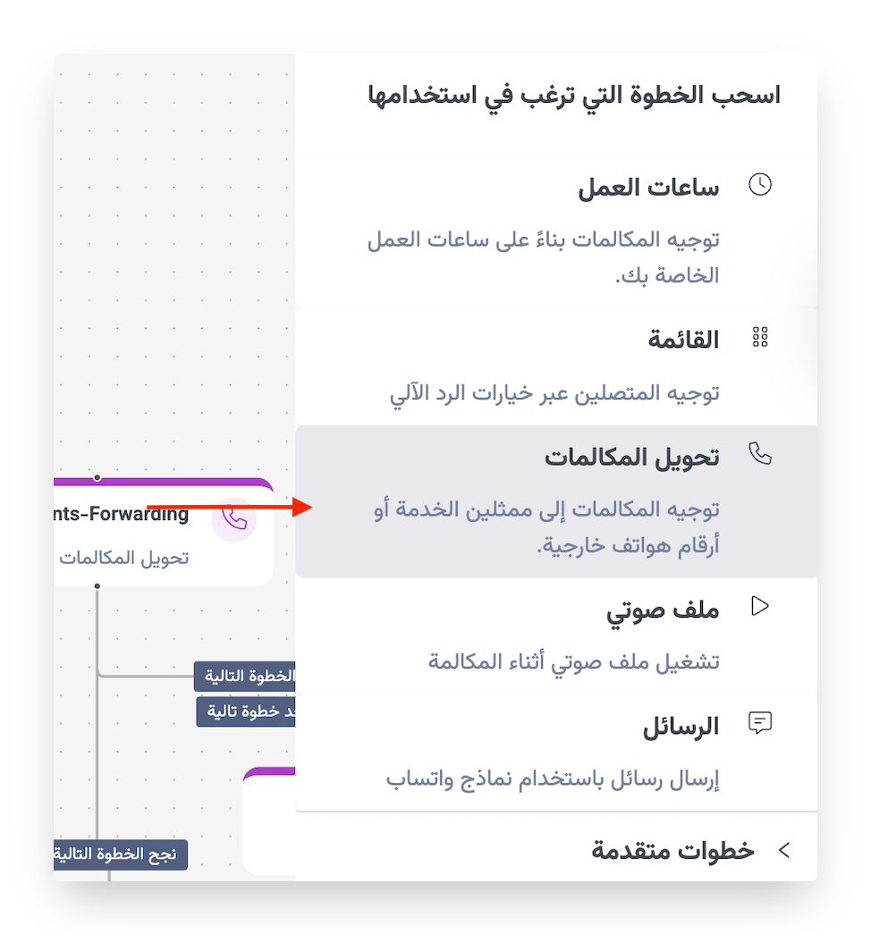 تتيح خطوة تحويل المكالمات توجيه المكالمات الواردة إلى ممثلي الخدمة أو المجموعات أو أرقام هواتف ممثلي الخدمة لمعالجة استفسارات المتصلين بكفاءة عالية.