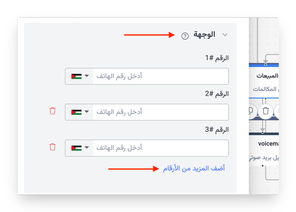 الوجهة: سرد أرقام الهواتف لاستقبال المكالمات المعاد توجيهها. يمكن إعداد أرقام متعددة، ويقوم النظام باختيار رقم عشوائي من القائمة لتوجيه المكالمة إليه.