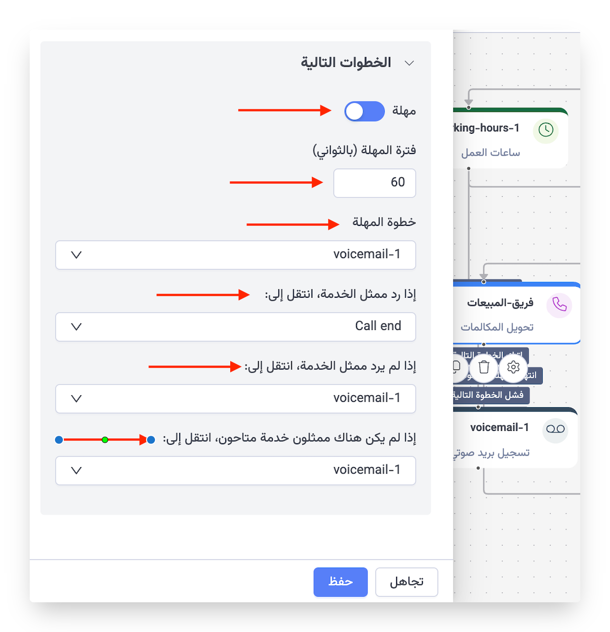 المهلة (بالثواني): المدة (بالثواني) التي ينتظرها المُتصل في قائمة الإنتظار قبل تفعيل خطوة المهلة.