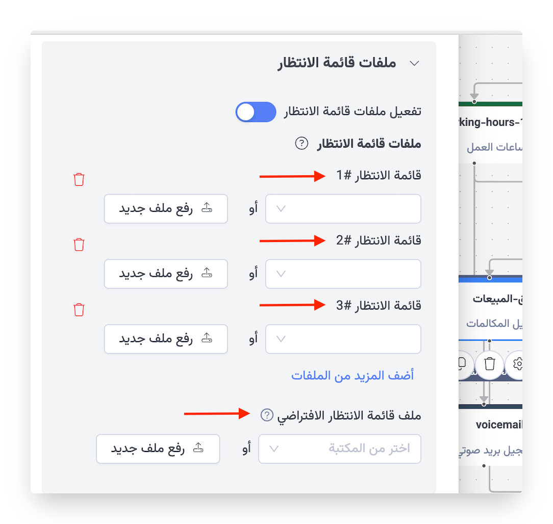 ملفات قائمة الانتظار: ملفات صوتية مخصصة تُشغل بناءً على موقع المتصل في قائمة الانتظار، لذا:\