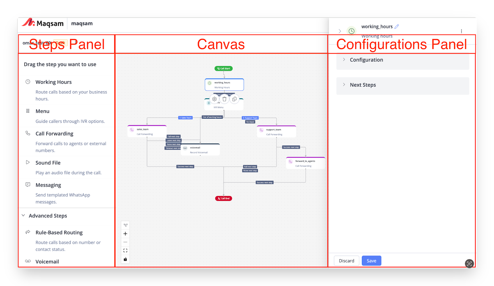The IVR (Interactive Voice Response) Builder in Maqsam allows you to create dynamic and customized call flows using a drag-and-drop interface. It provides an intuitive way to automate call handling, route calls based on conditions, and integrate messaging and voicemail functionalities seamlessly.