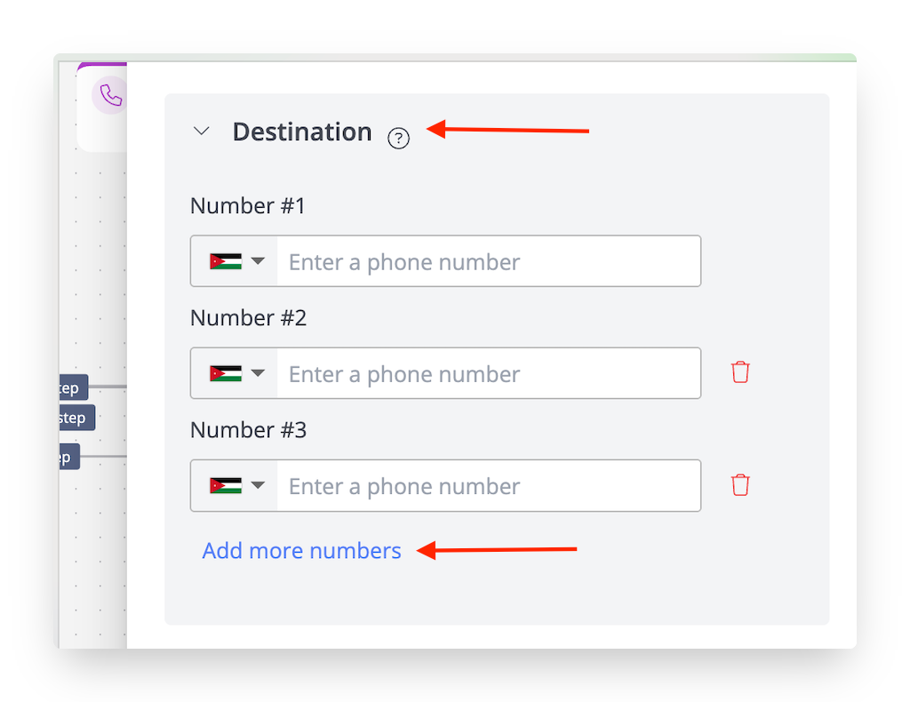 List the phone numbers to receive forwarded calls. Multiple numbers can be configured, and the system chooses a random number from the list to route the call to it.