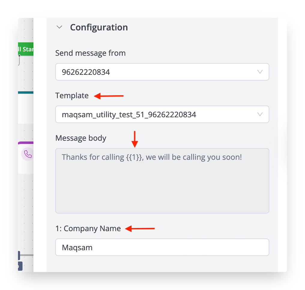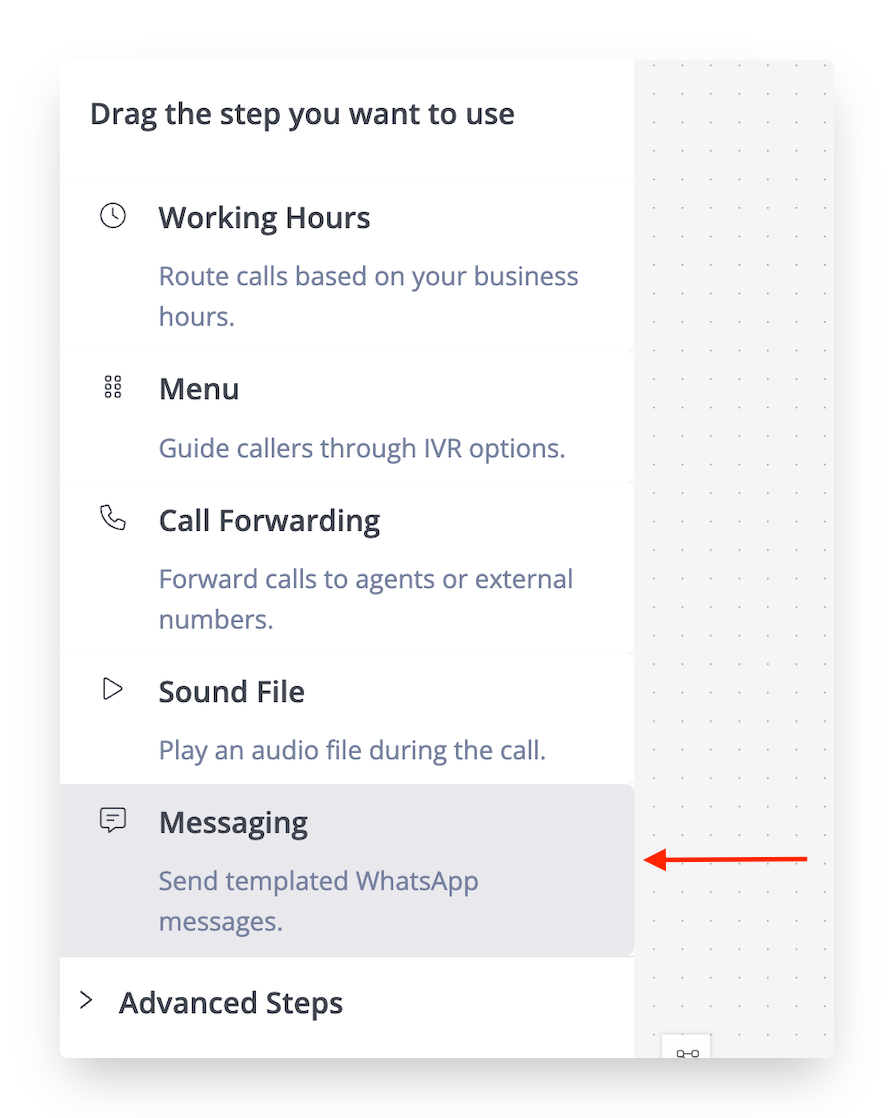 The Messaging Step sends a predefined WhatsApp template message to the caller when triggered. This makes automated communication simple and efficient during the IVR call flow.