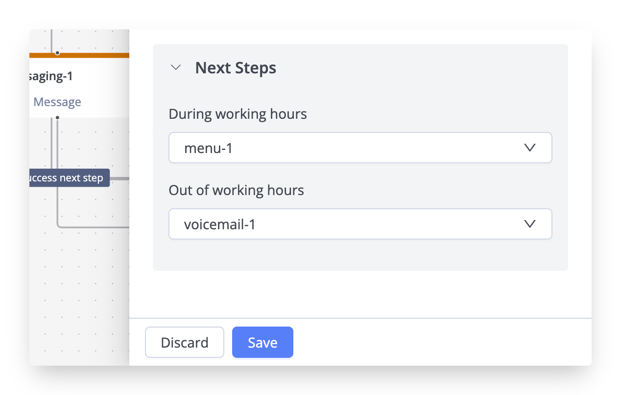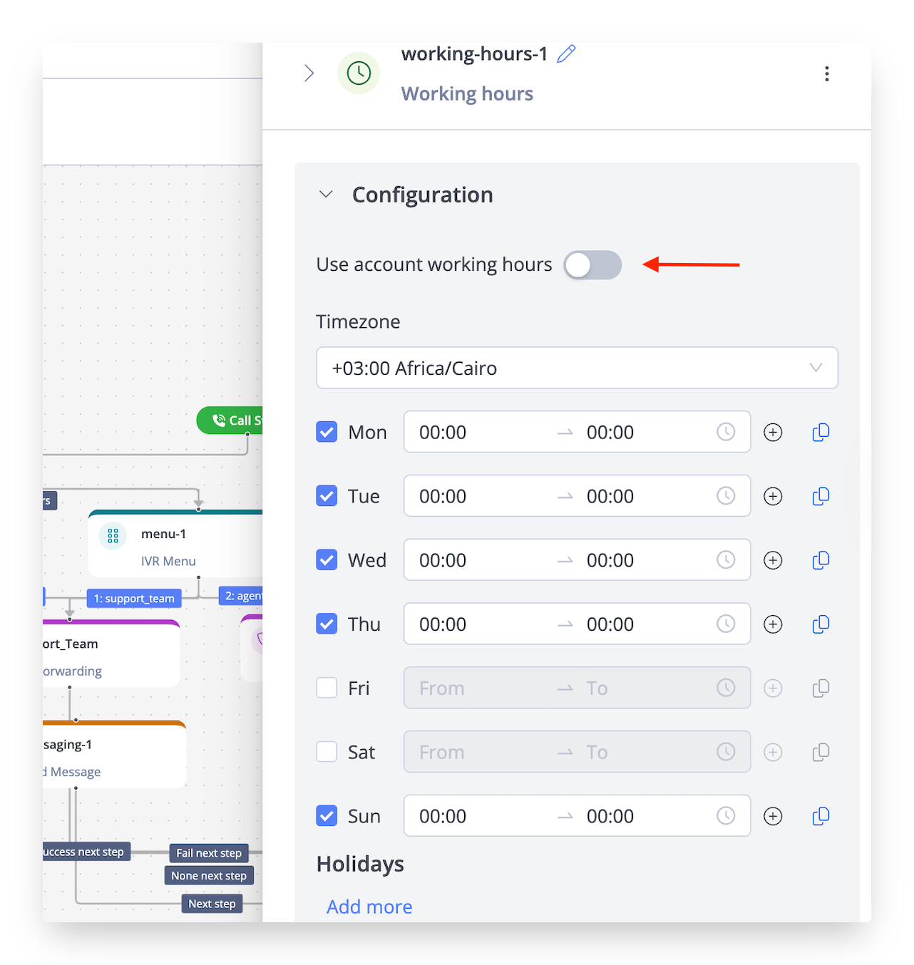 ❌ Toggle OFF: Customize working hours specifically for this IVR step, without affecting the account’s working hours or other IVR steps.