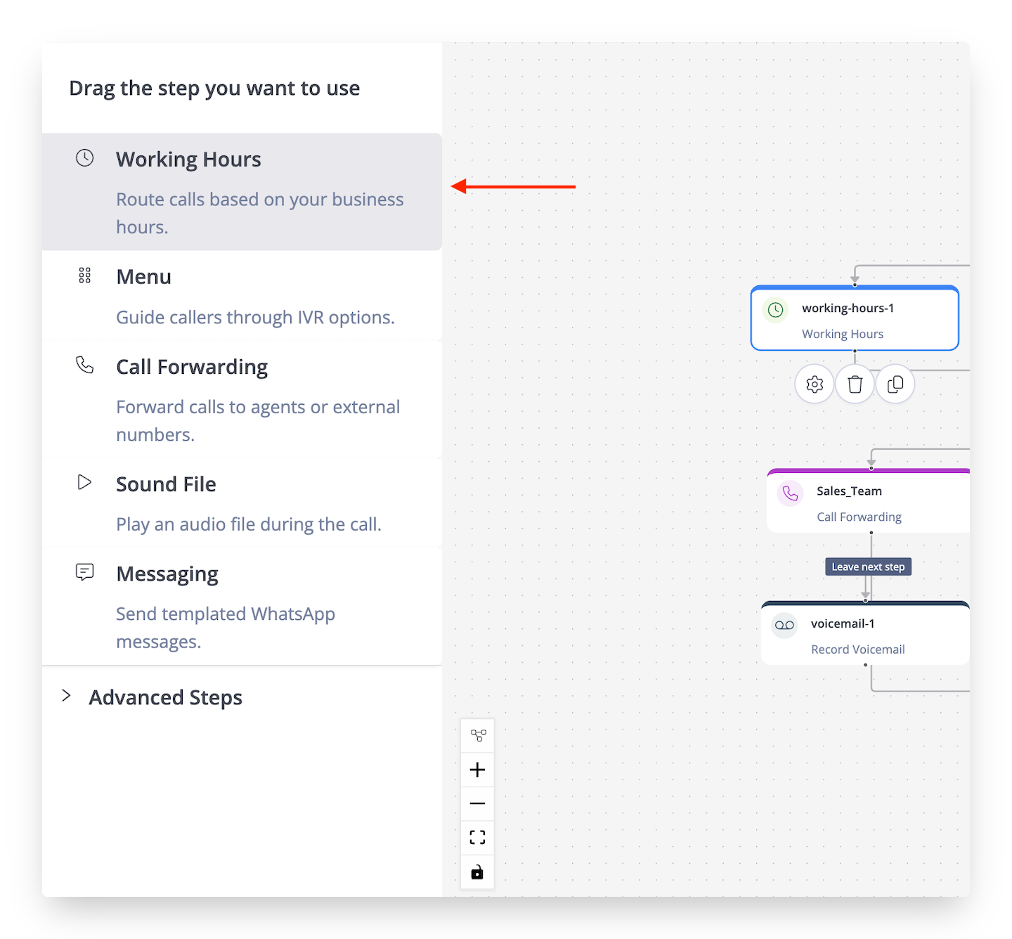 🌙 Out of Working Hours: Define the IVR steps for calls received outside working hours (e.g., routing to voicemail).