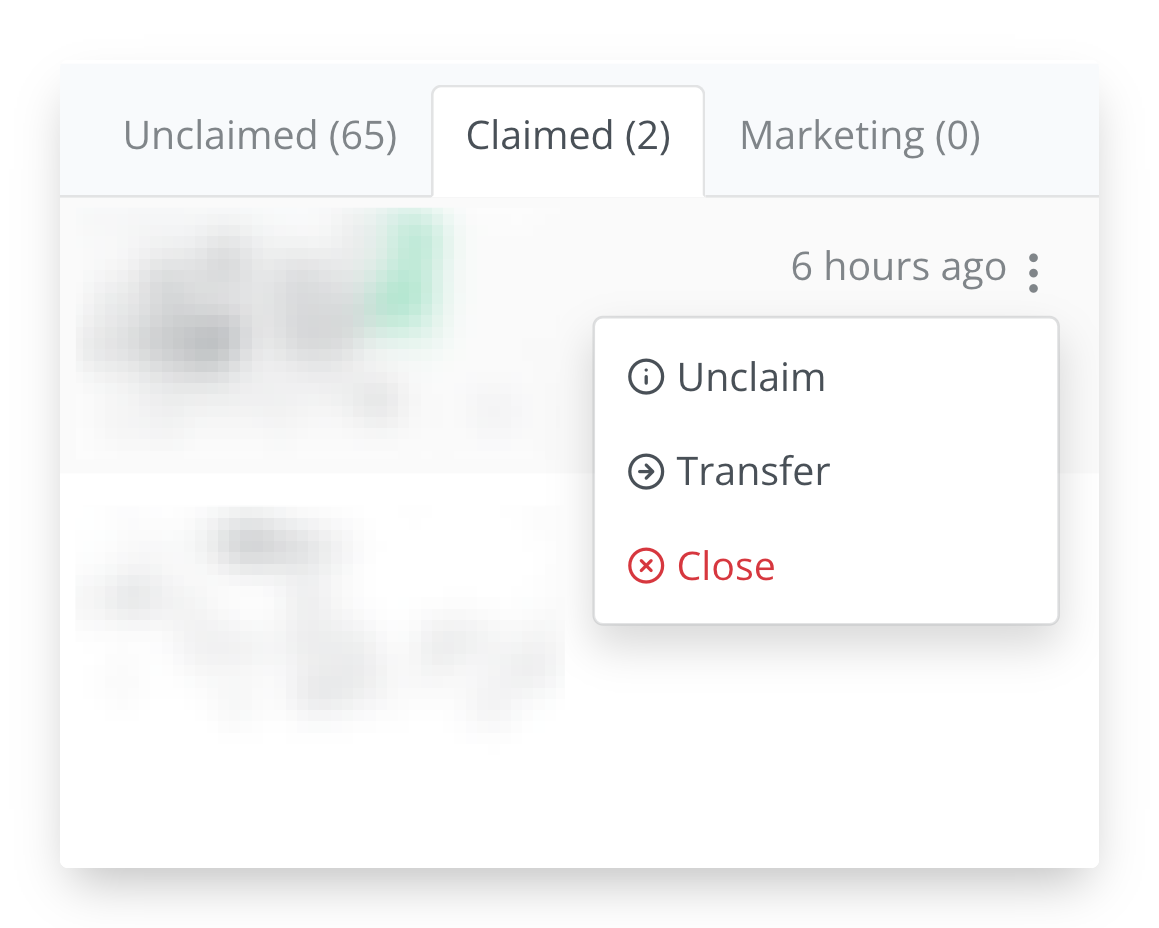 Each conversation is categorized under the tab Claimed, Unclaimed and can be transferred or closed by clicking the 3 dot menu per each conversation.